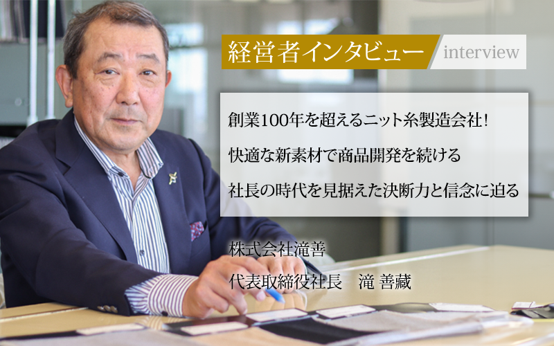 キュプラや美濃和紙などの生分解性素材を使用したニット素材向けの糸製造販売や開発を手がける、株式会社滝善。同社の代表取締役社長である滝善藏氏は、創業者の孫として2006年に社長に就任してから、売上の低迷やコロナショックなど数々の困難に直面した。同社の事業や今後の展望について、滝社長に話をうかがった。