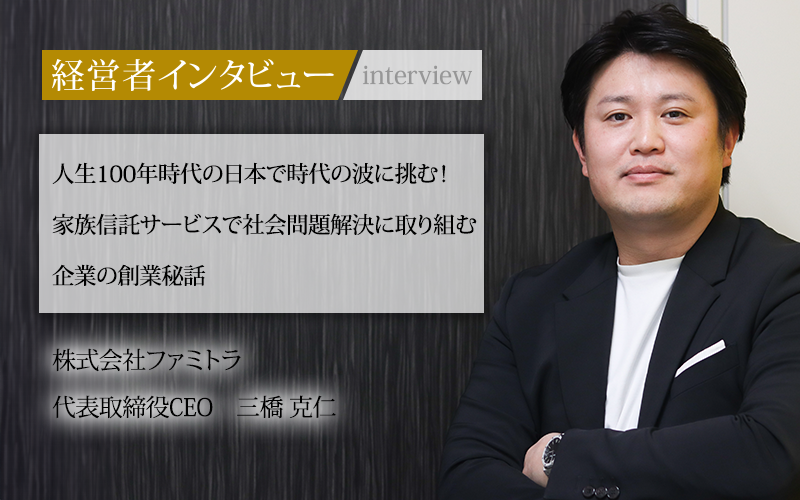 そんな中、株式会社ファミトラは資産凍結リスクという闇を打ち破るべく、家族信託の力を振るう。「家族信託を、あたりまえに。」というビジョンを掲げる同社は、どのようなサービスで日本の高齢化に立ち向かっているのか。そして、彼らの使命とは。今回は代表取締役CEOの三橋克仁氏が、その一端を明かす。