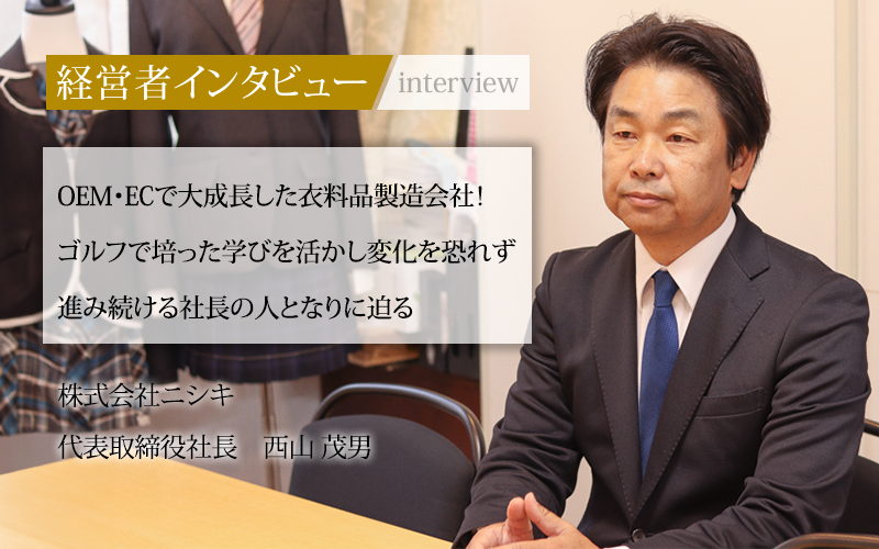 株式会社ニシキは社員15名(2024年4月現在)ほどでありながら、創業時からの制服製造販売に加え、アパレルOEM(※)や、自社ECサイトの運営を行い、ゴルフウェアブランド「ZIXIZ(ジクシーズ)」も立ち上げたばかりだ。次々に新しい取り組みに挑戦する企業文化はどこからくるのか。代表取締役社長の西山茂男氏に、企業文化を形成した歴史と社長の心構えについてインタビューした。