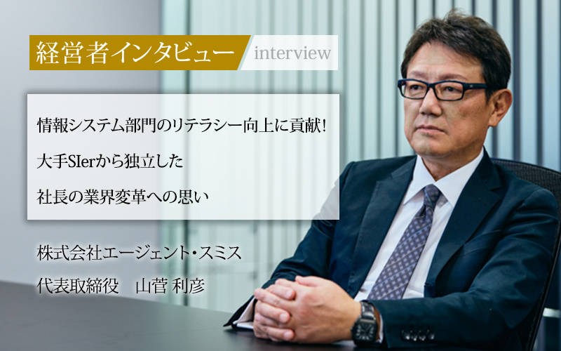 山菅利彦/1963年、栃木県生まれ。文教大学情報学部卒業。大手Sler企業に入社、34歳で最年少役員に就任し11年間役員を務めた後、2009年に株式会社エージェント・スミスを設立。現在は同社を含む5社の代表取締役社長を兼任。その他、2社の取締役および一般社団法人地域デジタル化推進協議会の代表理事も兼任している。