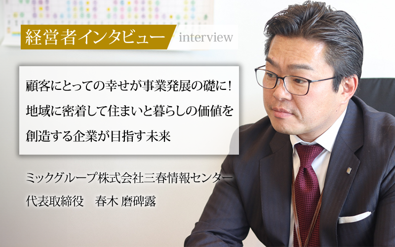 高校卒業後、海外に渡り見聞を広げ、三春情報センターの社長となった春木社長。諦めない姿勢を大切にしながら、長期的な目線で顧客の幸せを追及するサービスの展開をはかっている。インタビューをとおして、今後も顧客のライフスタイルを考えながら相乗的ににそれぞれの事業を活性化していきたいという強い思いが伝わってきた。