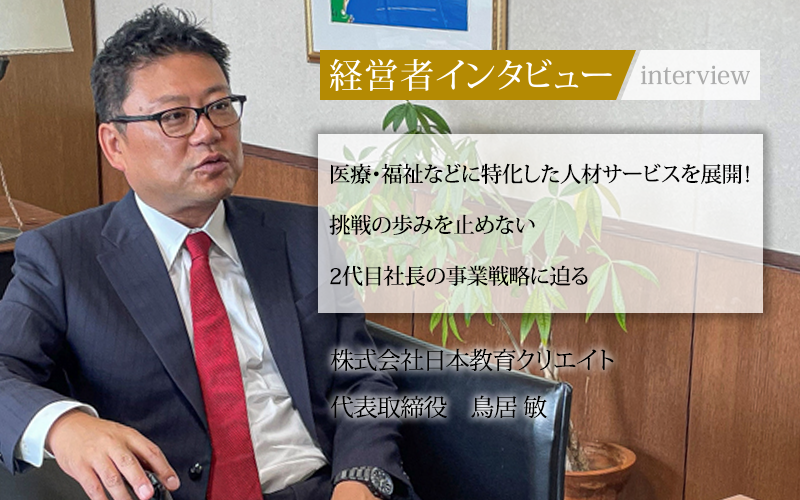 医療・福祉分野を中心に人材派遣や学習・研修事業を展開している日本教育クリエイト。現在社長を務めている鳥居敏氏は、父である創業社長から経営のバトンを継いだ2代目社長。三幸グループの学校運営を柱に置きながらも、その事業の内実は時代とともに変化を繰り返してきたという。今回は鳥居氏の経営者としての歩みを中心に、未経験から挑んだ人材サービス提供の軌跡を取材した。