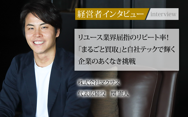 2012年の設立以降、出張買取を中心にリユース事業で成長してきた株式会社マクサス。創業者は、人気YouTubeチャンネル「令和の虎」でフランチャイズの事業計画をプレゼンし、投資家たちからの「完全ALL(賛同)」を達成した人物だ。代表取締役の関憲人氏に、会社の強みや起業の経緯についてうかがった。