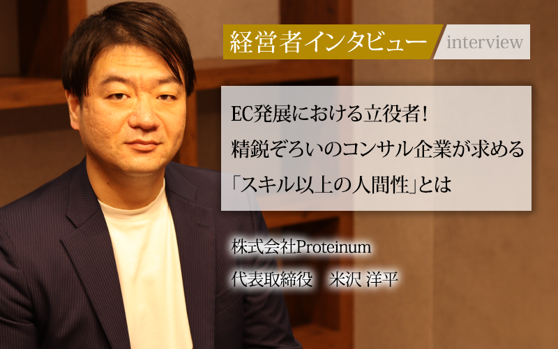 コロナ禍の2020年8月に創業し、ECコンサルティング事業で成長してきた株式会社Proteinum。大手・中小を問わず、ネット販売領域で課題を抱える企業を支援している。代表取締役の米沢洋平氏に創業のきっかけや事業の強み、採用のポイントをうかがった。