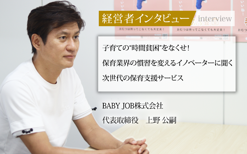 保育施設は子育てをする保護者にとって必要不可欠な存在であるにも関わらず、保育士不足や待機児童問題などの解決すべき課題が山積する業界。その中で、新たな風を吹かせているのが、日本初のおむつのサブスクサービス『手ぶら登園』などを仕掛けるBABY JOB株式会社である。異業種出身の創業者である代表取締役・上野公嗣氏に、起業に至るまでの経緯や、同社の問題意識とそれを解決するサービス・ビジョンの実現に向けた今後の展望などをうかがった。