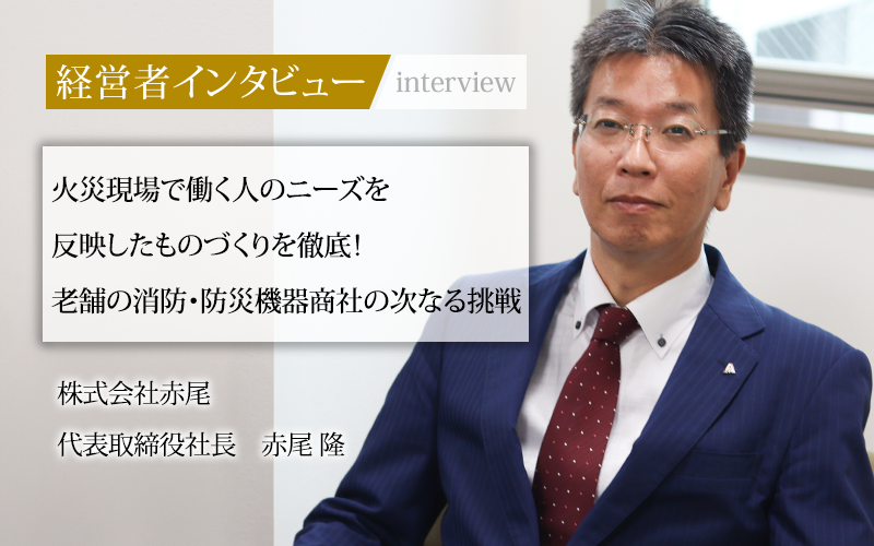 赤尾隆/1968年、大阪府生まれ。1991年、関西大学工学部卒業。1993年、関西大学大学院工学研究科修了。1993年、花王株式会社に入社。1997年、株式会社赤尾に入社。2011年、代表取締役社長に就任。2014年、一般社団法人日本消防服装・装備協会設立。初代会長に就任。2019年〜現在は、副会長として「消防服装等の普及・改良を図るとともに、防災思想の普及徹底に努め、もって火災その他の災害による被害の軽減に寄与すること」を目標に掲げ、日夜活動に励んでいる。