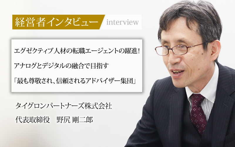 タイグロンパートナーズは、ハイクラス・プロフェッショナル人材に特化した転職支援で高い実績を上げている企業である。設立時から代表取締役を務める野尻剛二郎氏は、国内外で約20年にわたり日系・外資系金融機関で勤務した経験を活かし、金融領域の転職エージェントとして地位を築いてきた。
