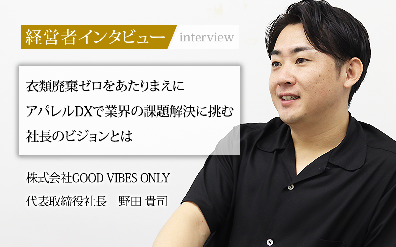 株式会社GOOD VIBES ONLYはそのような衣類廃棄をゼロにするべく、大量生産や余剰在庫などの課題解決を手掛ける。同社は、アパレルに特化したDXプラットフォームを開発した。アパレル経験も、デジタルスキルもゼロの状態から業界の寵児となった代表取締役社長の野田貴司氏に、その経緯や見据える未来について聞いた。