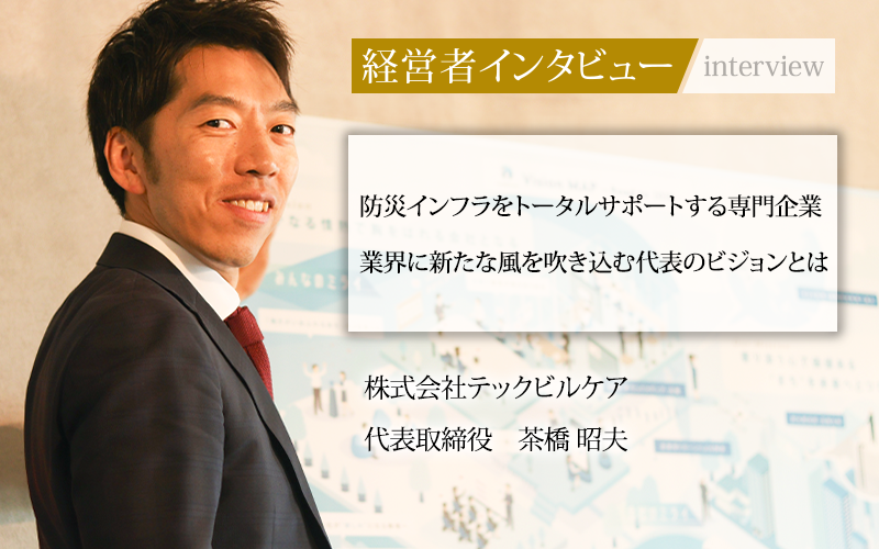 茶橋昭夫/1981年、大阪府生まれ。関西大学工学部を卒業後、IT企業、エアコンメンテナンス会社、防災設備メンテナンス会社を経て、2008年、株式会社テックビルケアに入社。2019年に代表取締役に就任。