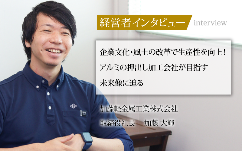 これらを解決すべく、環境に配慮したアルミ製造の新技術開発や、製造で使用する材料の削減を展開する加藤軽金属工業株式会社。旧態依然とした社内環境の打破に挑み、革新的な取り組みを牽引する取締役社長、加藤大輝氏に事業継承の経緯や、事業内容とビジョンなどについて聞いた。