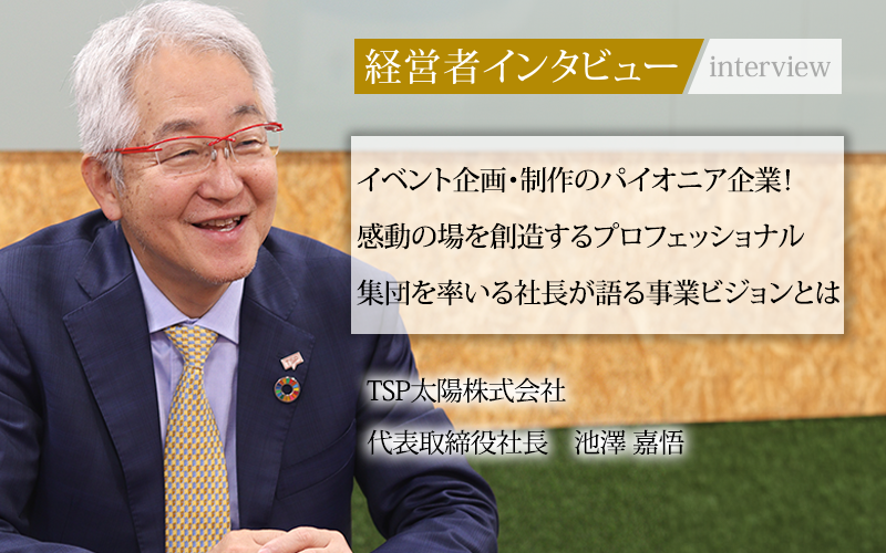 池澤嘉悟/1962年生まれ。兵庫県出身。1988年、TSP太陽株式会社入社。入社以来、世界リゾート博や愛知万博などの国際博の会場計画や運営・輸送業務のプロジェクトに参加し、事業の拡大と推進の役割を担う。2004年にクリエイティブ本部長、2008年に企画営業本部長を経て、2014年に取締役、2020年に副社長執行役員に就任。2022年、代表取締役社長に就任し、現在に至る。