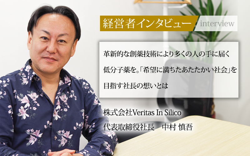 中村慎吾/1972年生まれ。2000年、名古屋大学大学院工学研究科有機化学分野で博士号を取得した後、イェール大学にて博士研究員として核酸の分子細胞生物学について研究。2003年に武田薬品工業株式会社に入社後、mRNAに対する低分子創薬プロジェクトを7年間運営。その後、Dow Chemicalにて営業部マネージャー、Catalent Pharma Solutionsにて事業開発ディレクター、株式会社産業革新機構(現株式会社産業革新投資機構)で戦略投資ディレクターを務める。2016年11月に株式会社Veritas In Silicoを設立し、代表取締役社長に就任。