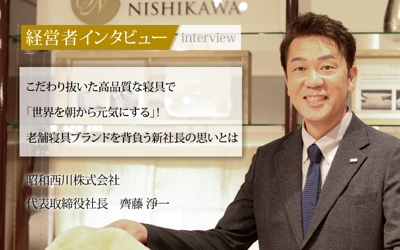 旧Futonto株式会社の社長だった齊藤淨一氏は2024年に昭和西川の社長に就任、その後両社は合併した。実は齊藤社長は京都西川販売店の出身であり、合併に伴い再び“西川”に戻った形となる。会社や商品である寝具に込める思いと昭和西川の今後について齊藤社長にうかがった。
