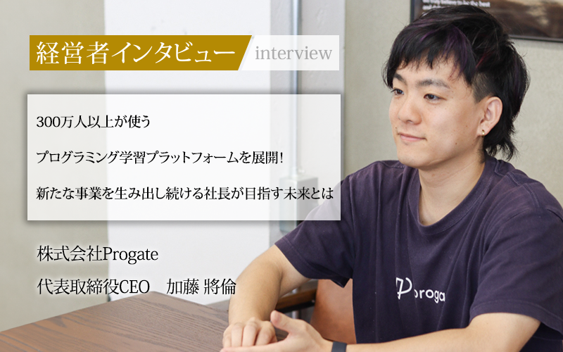プログラミングをオンラインで学べるプラットフォーム「Progate(プロゲート)」を提供する株式会社Progateは、2014年創業のベンチャー企業である。今や300万人以上のユーザーを有する「Progate」を核に、人材マッチングやエンジニア育成など新たな事業を次々に生み出している。同社を創業した加藤將倫氏に、創業のきっかけや会社の未来についてうかがった。