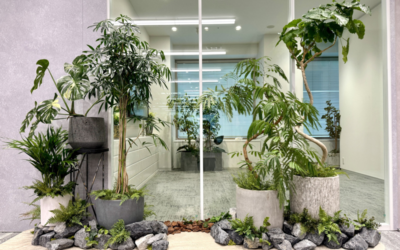 また、2019年からは視界に入る緑の量を示した緑視率の向上が生産性にも関わるという情報を受け、会社や職場に観葉植物の設置を提案するオフィスグリーン事業にも注力しています。本社にて國分を含めた植物スタッフのノウハウを取り入れ、屋内でも楽しめる緑の育成に試行錯誤した結果、生き生きと育ちメンテナンスを行うことで長く楽しめる緑を提供できるようになったのです。