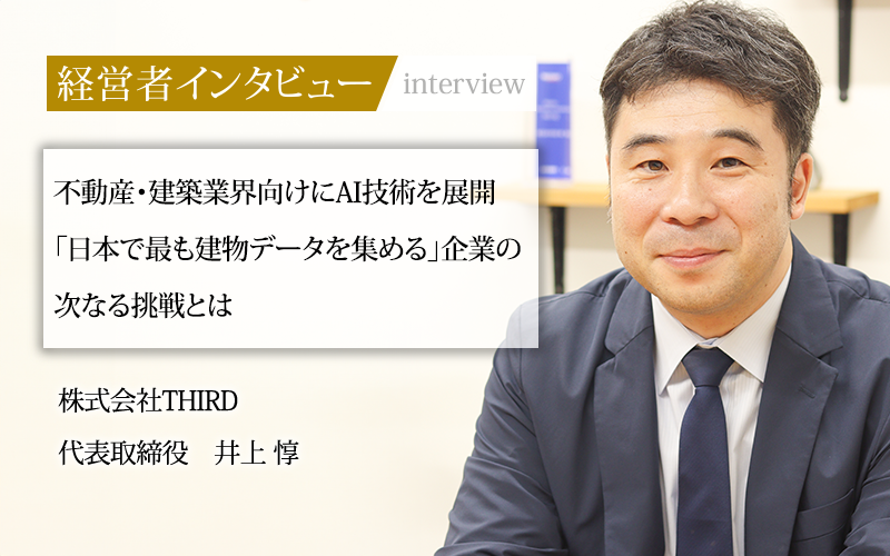 不動産のライフサイクルは用地取得から設計・施工、運営管理までと、事業期間が長く、多様なステークホルダーが存在する。そのため、必要なデータが1カ所に蓄積されづらく、デジタル化が遅れているレガシーな業界だ。そのような不動産業界でAIを活用し、変革を牽引する株式会社THIRDは、さまざまな企業から信頼され続けている会社だ。今回は代表取締役の井上惇氏に、新事業の取り組みや成功のきっかけ、企業ポリシー、今後の展望などについてうかがった。