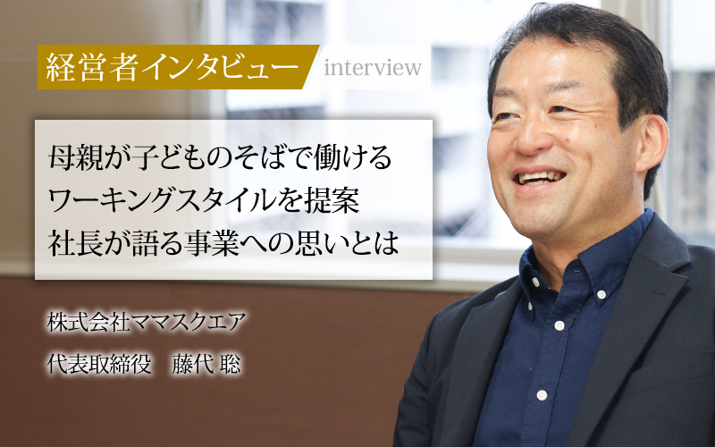 「子どもの笑顔を増やしたい」という想いから「子供のそばで働ける世の中をあたりまえに」を企業理念に、独自のビジネスモデルで働く母親たちに新たな可能性を提供し続ける株式会社ママスクエア。親子カフェから始まり、”託児付ワーキングスペース”の運営をメインに、BPO、保育事業や、行政との連携事業など、企業の人材不足解消、地域経済の活性化、少子化対策にも大きな役割を果たしている。同社の代表取締役である藤代聡氏に、事業への思いと今後の展望についてうかがった。