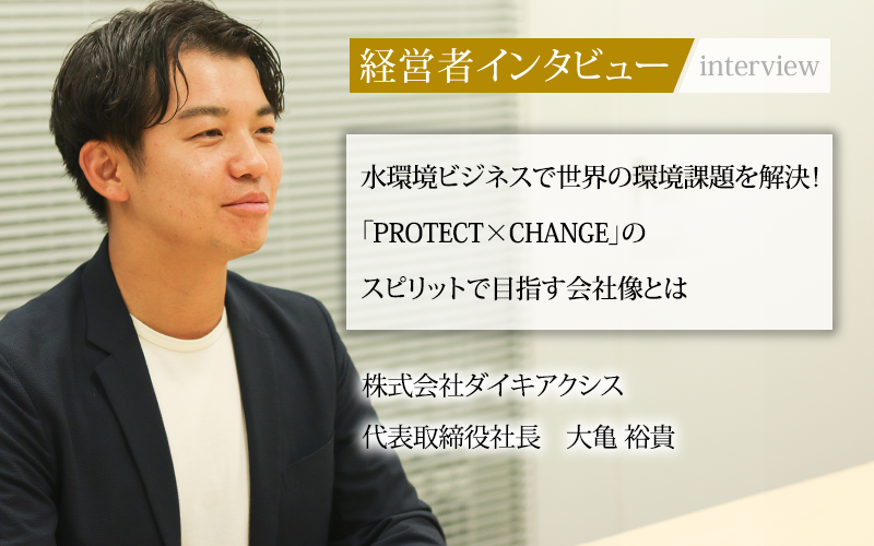 浄化槽や産業排水処理など、「水」に関連した事業を軸に展開する株式会社ダイキアクシス。衛生陶器の専門店として始めた事業が、住宅機器関連、太陽光や風力などの再生可能エネルギー関連、さらには家庭用飲料水事業にまで拡大し、世界の環境問題解決へ貢献している。創業から65周年の節目となるタイミングに3代目社長として就任した大亀裕貴氏。社会人4年目にして役員、31歳という若さで代表取締役社長に就いた同氏の当時の心境や、困難の乗り越え方、今後の会社としての展望について話をうかがった。