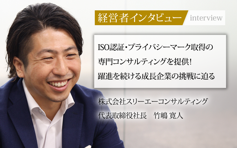 そこで、多くの企業から支持を受けているのが、認証取得や運用、更新に関する専門的なサポート『認証パートナー』を提供する株式会社スリーエーコンサルティングだ。代表取締役社長である竹嶋寛人氏に、同社の強みや成長戦略や社内制度、そして今後のビジョンについて詳しくうかがった。