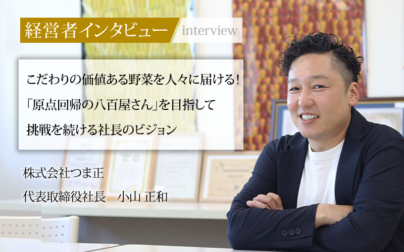 油脂類の原料の多くは輸入に頼っており、畜産物の飼料の自給率も低い。そこで国は令和12年度までにカロリーベースの総合食料自給率を45%まで引き上げるという目標を掲げている。このような中、株式会社つま正は「八百屋」として、生産者の思いを消費者に届け、野菜の価値を高めている。今回は、同社の代表取締役社長である小山正和氏に話をうかがった。