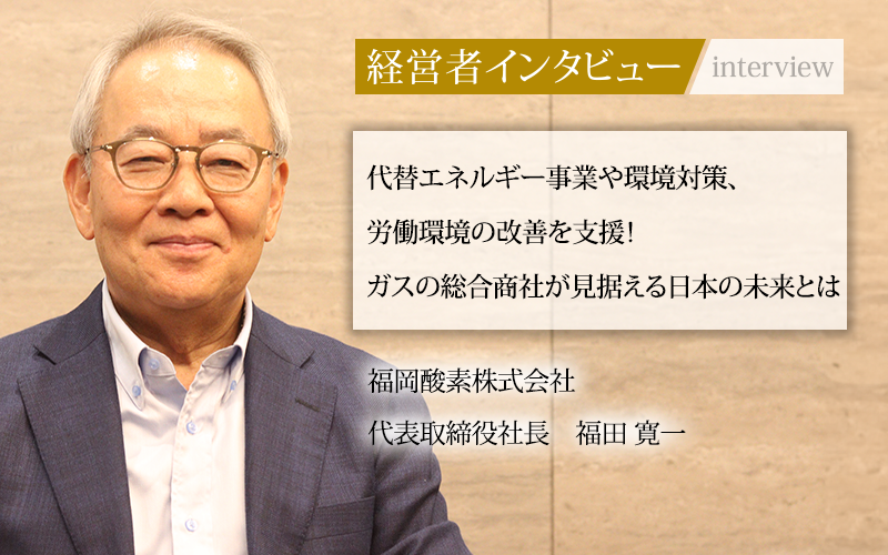 福田寛一/1953年、長崎県生まれ。1972年、鹿町工業高等学校卒業後、福岡酸素株式会社に入社。技術部門から営業部門へ転籍し、営業開発部部長、エネルギーガス部長を経て、2018年に代表取締役社長に就任。
