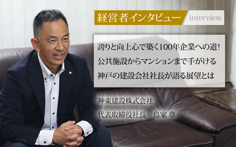鳥家章/1971年、兵庫県神戸市生まれ、神戸学院大学卒業。会社員、スポーツジムインストラクター、介護職員を経て2006年に神東建設株式会社へ入社。2年間、夜間建設専門学校に通いながら現場職を経験。その後、営業として活動し、2017年、取締役就任。2023年に代表取締役社長に就任。
