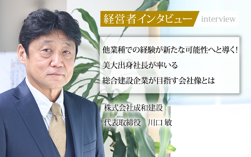 川口敏/1961年、大阪生まれ。武蔵野美術大学卒業。2014年、他業種(広告業、イベントプロデューサー)より転身し、株式会社成和建設に入社。2016年、代表取締役に就任。
