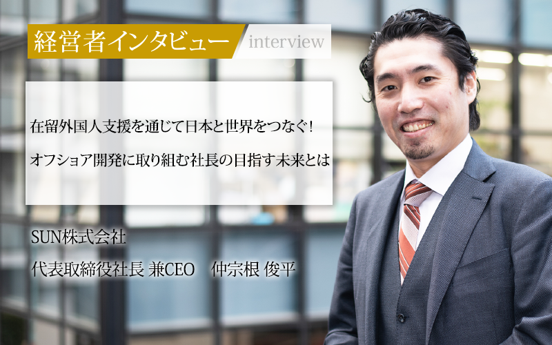 システムやWebサイトの開発を手掛ける、SUN株式会社の代表取締役社長兼CEOである仲宗根俊平氏は、そんな変わりゆく社会構造を味方に付け、オフショア開発(※)事業を始めた。なぜ仲宗根氏は世界を股にかけた働き方を選んだのか。事業に込められた思いや実現したいビジョンなどについて聞いた。