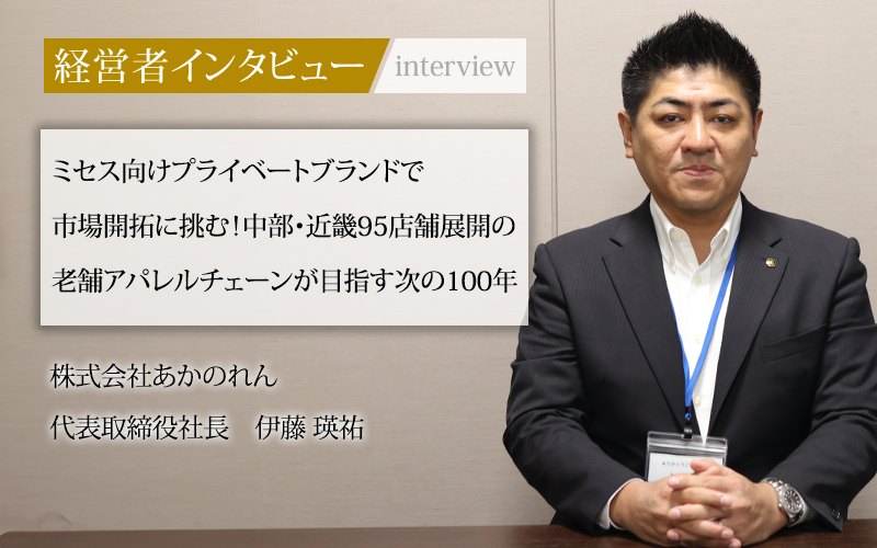 創業105年を迎えた株式会社あかのれんは、中部・近畿地方を中心に95店舗を展開する衣料品販売の老舗企業だ。「店はお客さまのためにある」という社是のもと、地域密着型の専門店として、日常生活に欠かせない商品を手頃な価格で提供している。