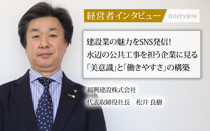 1953年に和歌山市で設立された福興建設株式会社。港の防波堤や護岸工事など、海や河川に関わる工事をメイン事業とする建設業者だ。会社の強みや仕事の魅力、今後の展望について、代表取締役社長の松井良樹氏に話をうかがった。