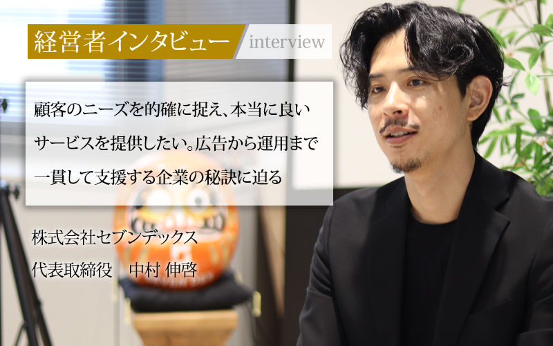 中小企業庁のデータによると、小規模事業者が重要と考える経営課題として、最も多いのは、「販路開拓・マーケティング」であり、その割合は25.6%にのぼる。そんな中、広告やデザインの知識を取り入れ、顧客の本質的な成長へのアプローチを得意とする企業がある。それが、2018年の創業以来、途切れることなく黒字経営を続ける株式会社セブンデックスだ。なぜ起業直後から黒字化を実現できたのか、その秘訣や企業としてのカルチャーについて、代表取締役の中村伸啓氏に話をうかがった。