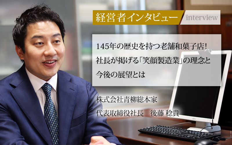 そんな和菓子業界において、1879年の創業以来、長く愛され続け145周年を迎えた株式会社青柳総本家は、伝統的な和菓子の製造販売だけでなく、時代のニーズに応じた新商品開発や海外展開にも積極的に取り組んでいる。今回は、6代目となる代表取締役社長の後藤稔貴氏から、経営理念、人材採用、そして今後の展望などについてうかがった。