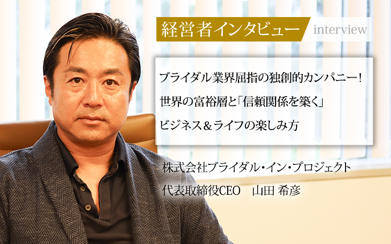 山田希彦/1973年生まれ。青山学院大学を卒業後、日興証券(現:SMBC日興証券株式会社)に入社。日本最年少のプライベートバンカーとして活躍。その後、ドイツ銀行・証券会社にてプライベートバンキング部の立ち上げに参画。独立し、2002年に株式会社ブライダル・イン・プロジェクトを設立、代表取締役に就任。同社グループCEO。関連会社・ギフトライフ社にて、来日する世界の富裕層相手に陸海空のモビリティコンシェルジュサービス「A Wonderful Day」を展開。