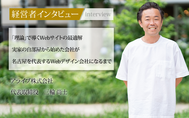 そこに着目したのが、名古屋市でWebデザインを行っているアライブ株式会社だ。代表取締役の三輪尚士氏が創業し、顧客の目標達成を第一にしたWebデザインを提供して成長してきた。しかし、三輪社長の挑戦は順風満帆ではなかったという。