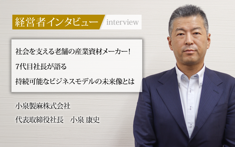 小泉康史/1976年生まれ。甲南大学卒業。1999年、小泉製麻株式会社に入社。2009年、事業開発部長に就任。その後、常務取締役 経営企画本部長を歴任し、2015年に代表取締役社長に就任。
