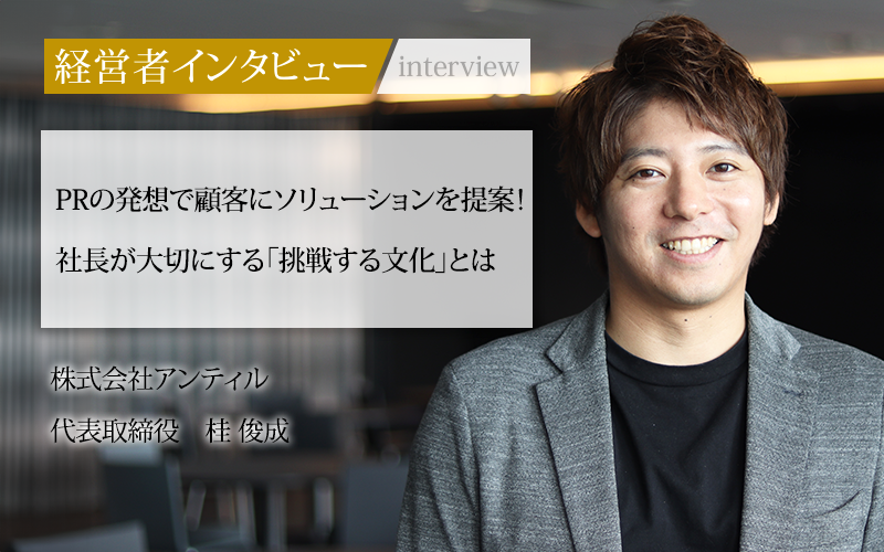 PR戦略の立案や実行、PRの発想をとり入れたマーケティング施策でクライアントの課題解決に取り組む株式会社アンティル。同社は、PR業界で豊富な実績を持つ株式会社ベクトルのグループ会社だ。そんな同社を率いるのが、新卒入社8年目で代表取締役に就任した桂俊成氏だ。「クライアントの理想を叶えたり、理想を一緒につくっていけるパートナー企業でありたい」と熱く語る同氏に、経営者として大切にしている価値観を聞いた。