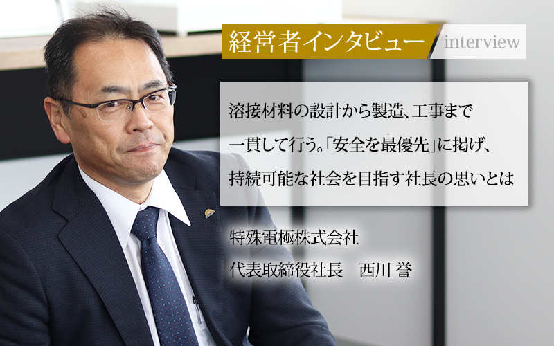 その中でも、高硬度で割れや歪みの少ない製品の販売や、経年で摩耗した部分を再生させる特殊な溶接を行っているのが特殊電極株式会社だ。同社の研究開発部、工事技術部、営業を経験した代表取締役社長の西川誉氏に溶接に対する思いや会社の理念についてうかがった。