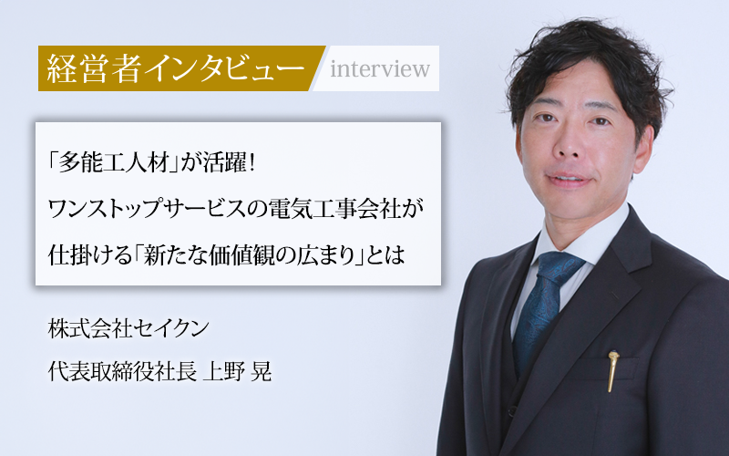上野晃/名古屋市出身。海外留学を経て父が経営する株式会社セイクンに入社。2011年にCOO、2019年に代表取締役社長に就任。自社サイトとは別に「シーケンサーメンテナンス.com」と「避雷針工事.net」と「防爆工事.com」など専用サイトを開設。