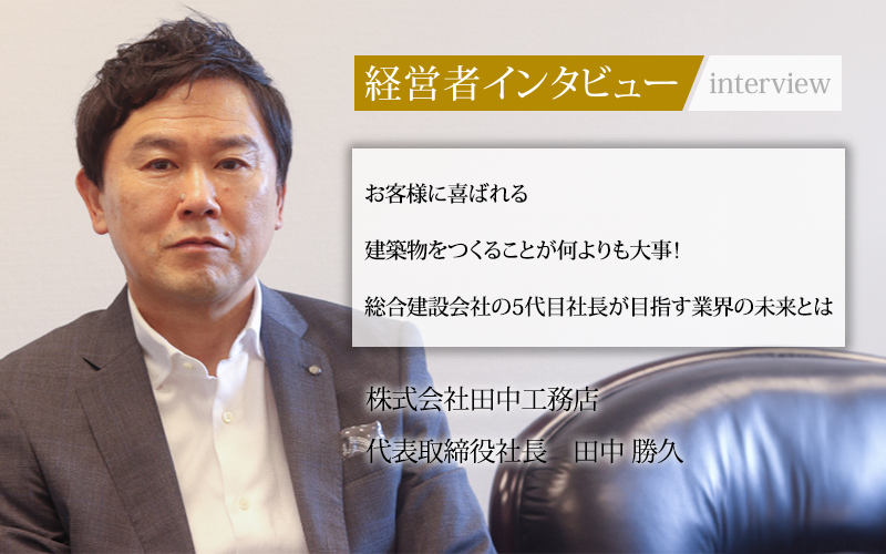 明治39年の創業以来、地域密着を掲げ、京都で100年以上にわたって地元の建築業界をリードしてきた株式会社田中工務店。代表取締役社長の田中勝久氏に、ターニングポイントとなった出来事、代表取締役として心がけてきたこと、そして将来の夢についてうかがった。
