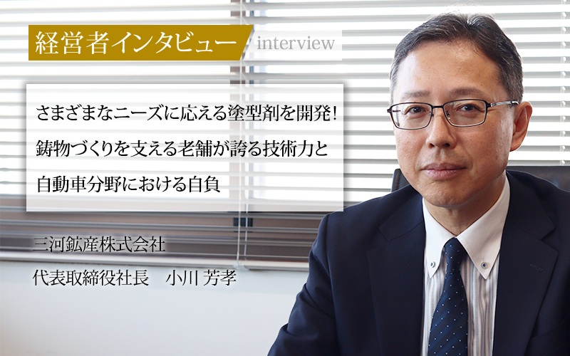 1948年に創業し、愛知県碧南市に本社を置く三河鉱産株式会社。76年という長い歴史の中で鋳造用塗型剤事業を発展させ、自動車メーカーをはじめとするさまざまな業界を支えてきた。2022年に代表取締役社長へ就任した小川芳孝氏に、就任の経緯や現在の事業内容、今後のビジョンについてうかがった。