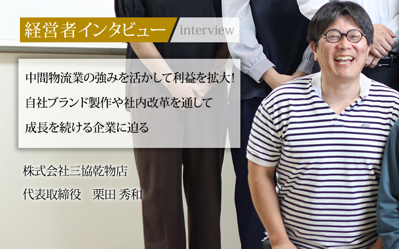 栗田秀和/1972年、岐阜県出身。1993年、滋賀文教短期大学初等教育科卒業後に三協乾物店入社。新規取引先開拓担当、営業課長、自社ブランド商品開発責任者、広域事業部開設担当役員などを経て2022年年2月代表取締役社長に就任。