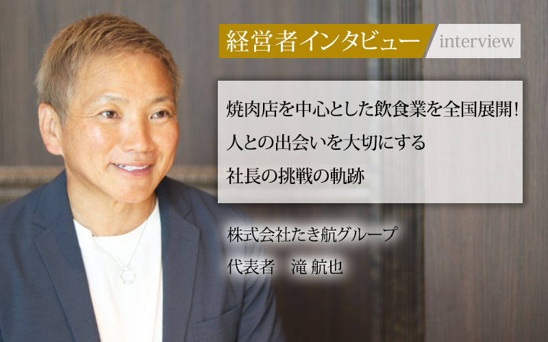 株式会社たき航グループは、「焼肉どうらく」を始めとする焼肉店や肉バル、イタリアンレストラン、ラーメン店などの飲食業を運営する会社だ。横浜市内を中心に20店舗以上の直営店を運営するほか、全国的にフランチャイズ事業も展開している。来春には生産センターの設立を予定しているという同社の代表者・滝航也氏に、起業から現在に至るまでの話をうかがった。