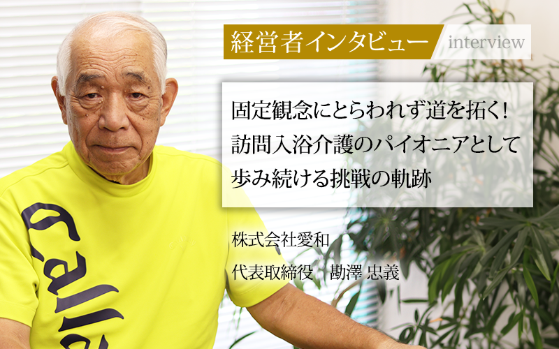株式会社愛和は、その前身である有限会社愛和サンクリーンの時代から訪問入浴サービスの提供を行ってきた、介護事業のパイオニア企業だ。介護保険制度が始まる17年前から介護の事業に携わり、現在では障害児通所施設の運営や、湯灌サービスなどのセレモニー事業、ペットのエンゼル・ケアサービスなど多岐にわたる事業を展開している。同社の代表取締役である勘澤忠義氏に、創業から現在までの事業と今後の取り組みについてうかがった。