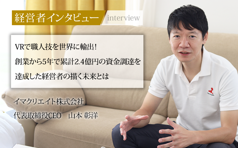 VR技術がいかに私たちの暮らしを変えるのか、そしてビジネスとしてどんな可能性を秘めているのか。創業から5年で累計2.4億円の資金調達を実現した同社の代表取締役CEOである山本彰洋氏に、経営者としての狙いや思いをうかがった。