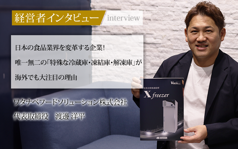 高電位電子エネルギーを活用した技術で、食品業界に変革をもたらしているワタナベフードソリューション株式会社。同社の特殊な凍結庫やスピード解凍庫、熟成庫は、食品の高鮮度凍結やスピード解凍を可能とし、今までになかった高品質な食品管理を実現している。