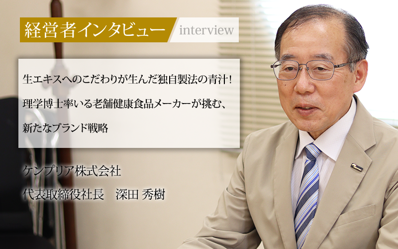 熱を加えない製法で酵素の活性を保ち続ける青汁から、温泉水を乾燥させてつくる温泉末入り入浴剤まで、独自の製品開発にこだわり続けているケンプリア株式会社。研究開発の視点を持つ同社代表取締役社長の深田秀樹氏は、データ分析による経営判断と、伝統を守り抜く製法へのこだわりで、ブランドのさらなる価値の向上を目指している。今回は、変化の激しい健康食品市場における同社の挑戦についてお話をうかがった。