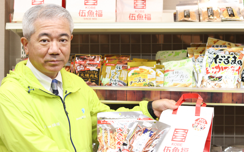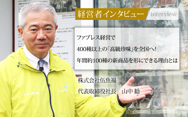 同社はイカ製品や魚介類の加工品から始まった会社だが、つくだ煮や肉製品など、品ぞろえを増やし続け、今では全国でさまざまな珍味を販売するようになった。この成長を支える秘訣とは何なのか。代表取締役社長の山中勧氏に、伍魚福の経営戦略や事業へのこだわり、今後の展望などを聞いた。