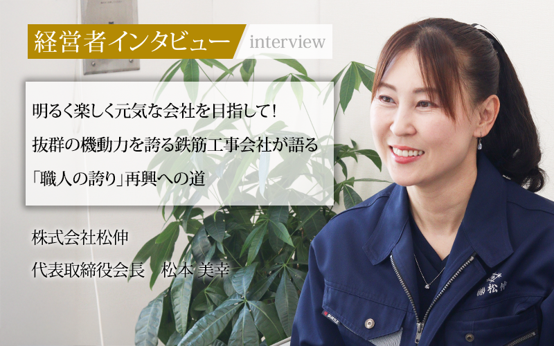 鉄筋工事のプロフェッショナル集団である株式会社松伸。創業50周年を迎えた同社は、鉄筋の加工から運搬、施工までをワンストップで手がける。「明るく楽しく元気な会社」を掲げ、新人からベテランまで幅広い世代が活躍。自社の運送部門や直用の職人を擁し、北海道から静岡まで幅広く事業を展開する。今回は、「職人の誇り」を取り戻すべく挑戦を続ける同社の代表取締役会長、松本美幸氏にお話をうかがった。