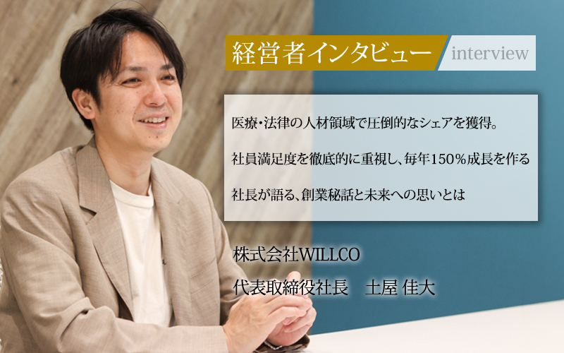 そうした専門職の人材領域にはびこる課題にフォーカスし、事業を展開しているのが、株式会社WILLCOだ。専門職領域に人材課題、またWILLCOが掲げる働く幸せとはどのような考えに基づくのか。代表取締役社長の土屋佳大氏に、こうした理念に至った起業の背景や、今後の事業のテーマについてうかがった。