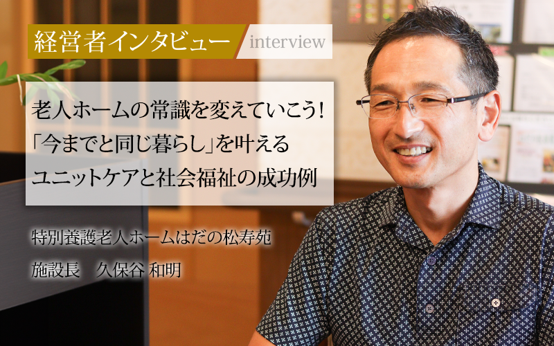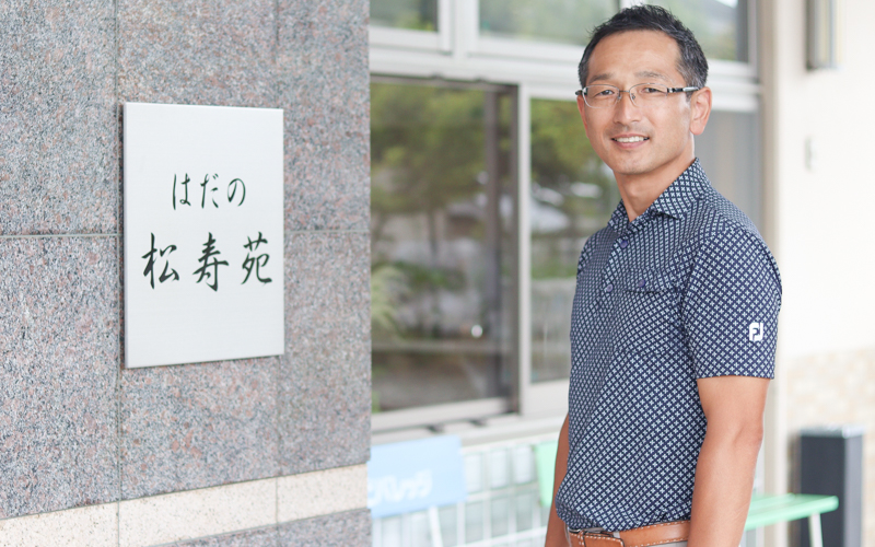 久保谷和明/1976年、神奈川県生まれ。2004年に社会福祉法人寿徳会に入職。2005年、特別養護老人ホーム「はだの松寿苑」にオープニングスタッフとして配属。2021年、施設長に就任。特別養護老人ホームはだの松寿苑の施設長として、現在は事業の拡大にも注力している。
